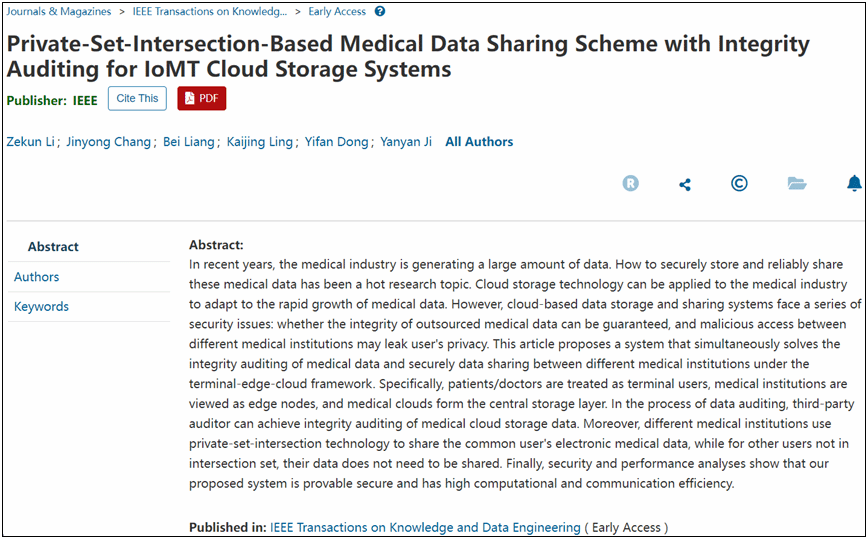 SCI一区Top, 中国计算机学会和中国人工智能学会共同推荐的A类期刊,影响因子10.4)上发表题为“Private-Set-Intersection-Based Medical Data Sharing Scheme with Integrity Auditing for IoMT Cloud Storage Systems”(云存储环境下基于隐私集合求交的医疗数据共享与完整性审计方案)的学术论文。论文第一作者为三级片