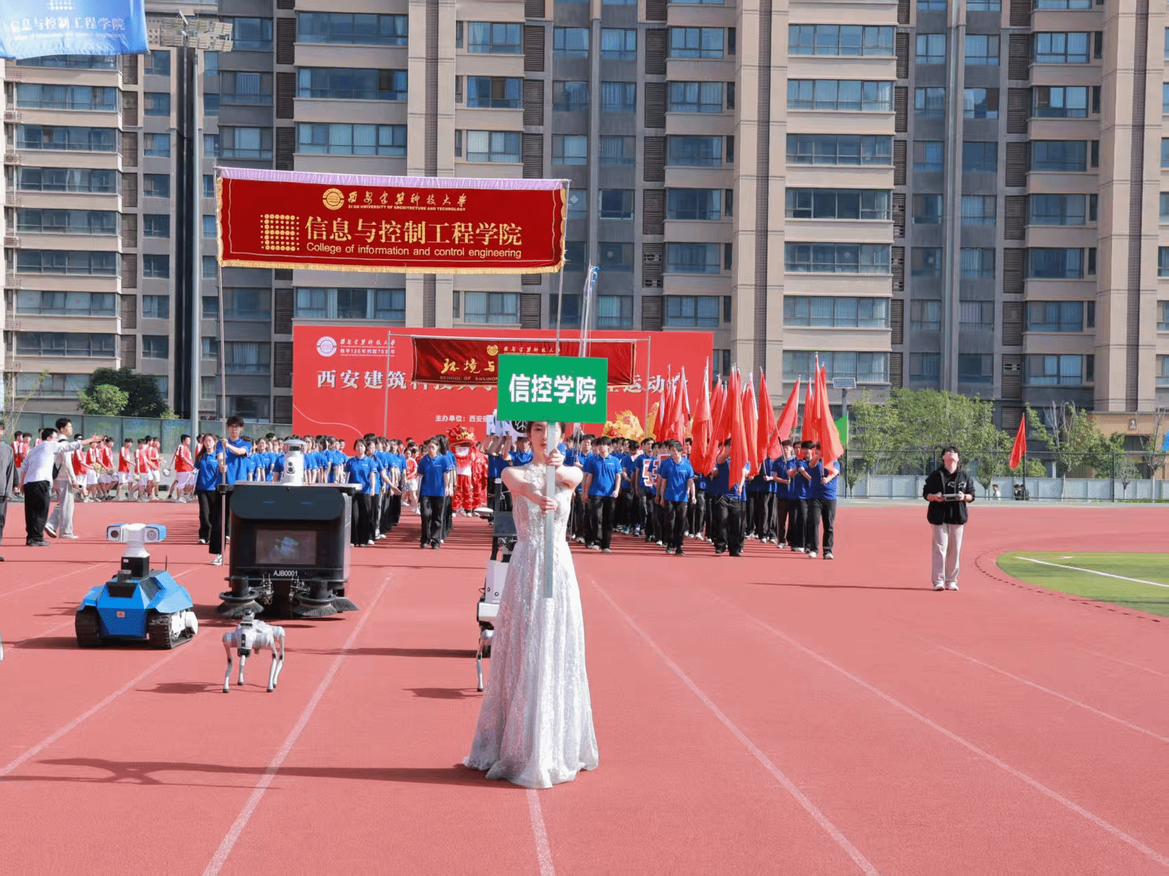 运动员代表队步履坚定,意气风发。在机器狗及从信控楼停机坪起飞的无人机空天地全景护航下,三级片