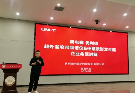 优利德科技(中国)股份有限公司市场部应用工程师张亚博围绕优利德企业命题开展专题宣讲。他详细介绍了超外差窄带频谱仪、任意波形发生器两大技术方向,重点讲解关键模块设计要求,并说明企业为参赛团队提供的技术支持、开发资料、硬件补贴与专项奖励,为同学们对接产业需求、参与企业赛道提供清晰指引。